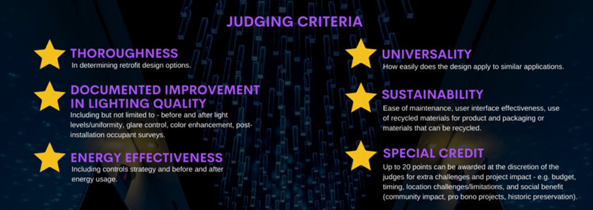 The main intent of the program is to promote best practices for a variety of indoor and outdoor lighting applications. The program aims to recognize and showcase projects that provide a narrative and “how to” guide for others with similar lighting retrofit challenges.